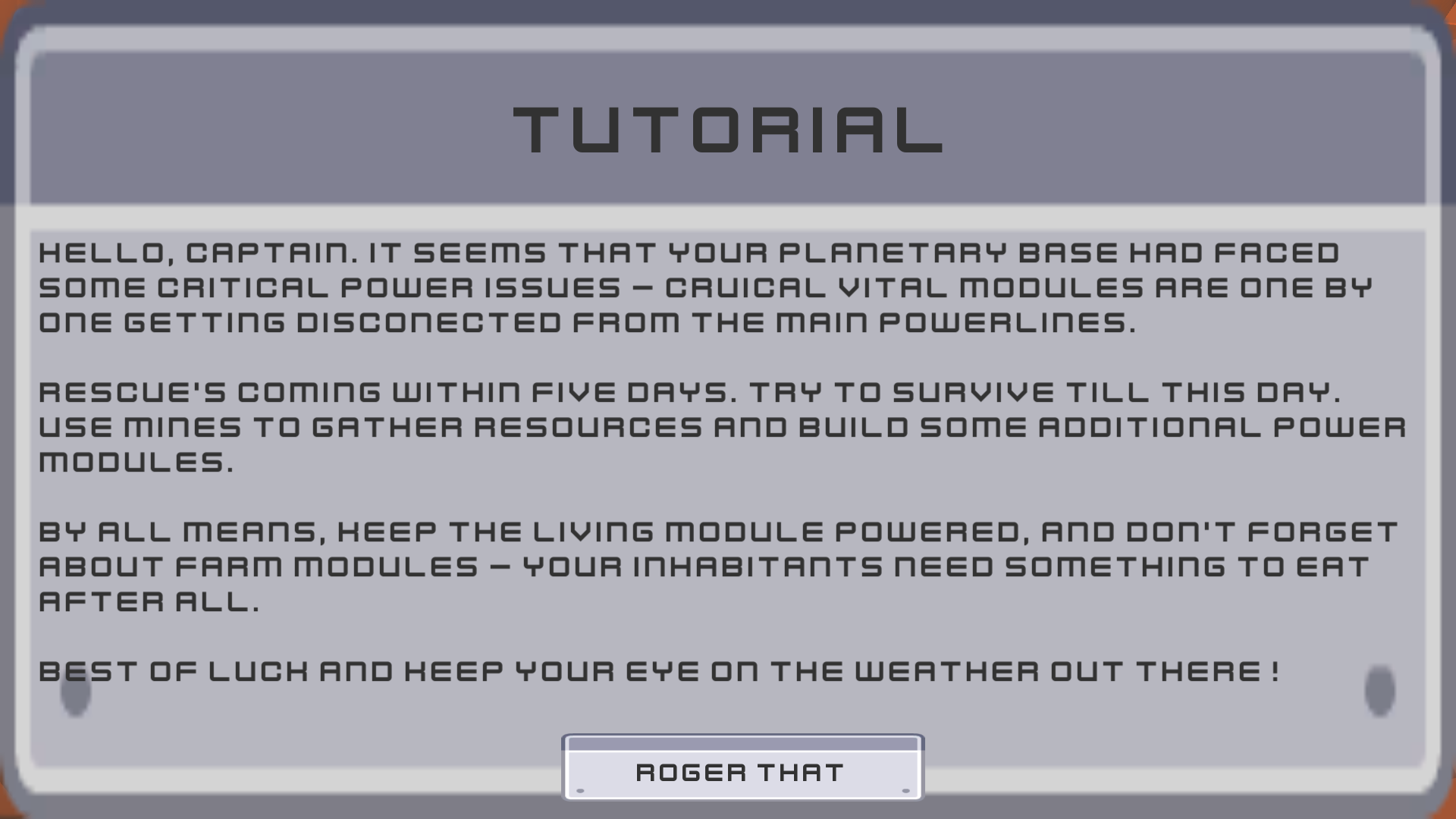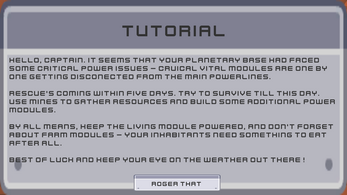 POWERLESS is a simple base-builder game about generating and managing power for the slowly disconnecting space base. Can you survive until the rescue arrives?